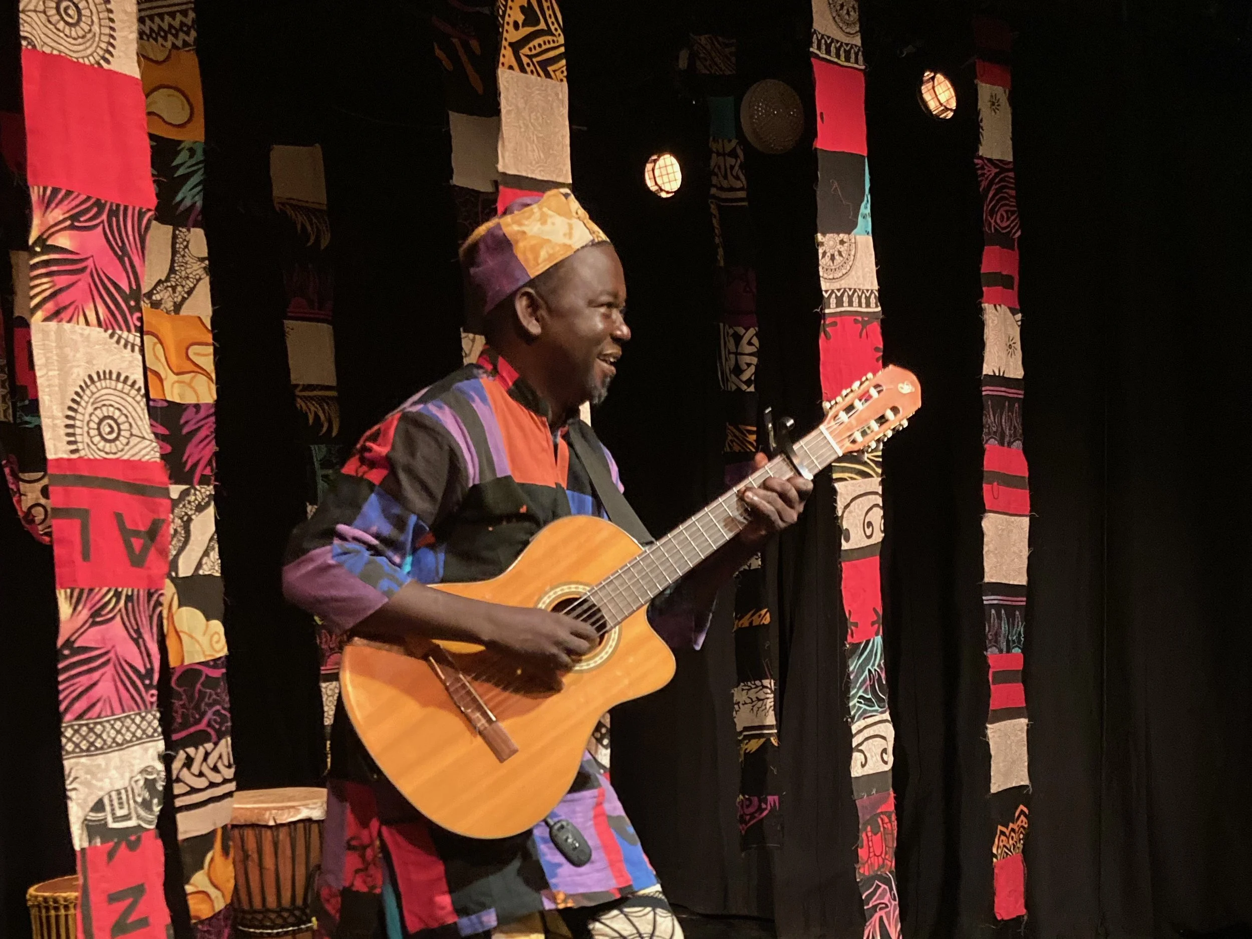 Le spectacle commence avant même l’entrée dans la salle : accueilli par le griot, guitare à la main, le public est plongé dans l’ambiance chaleureuse et festive d’un village sénégalais. Une fois installés, les spectateurs voyagent à travers trois contes soigneusement choisis.